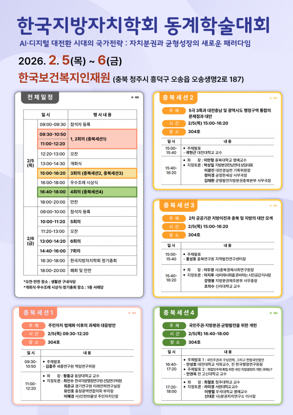 2. 한국지방자치학회는 AI·디지털 대전환이라는 국가적 변화 속에 지방자치의 새로운 역할과 국가균형발전 전략을 모색하기 위해 2026년 동계학술대회를 2월 5일부터 6일까지 한국보건복지인재원에서 개최합니다.